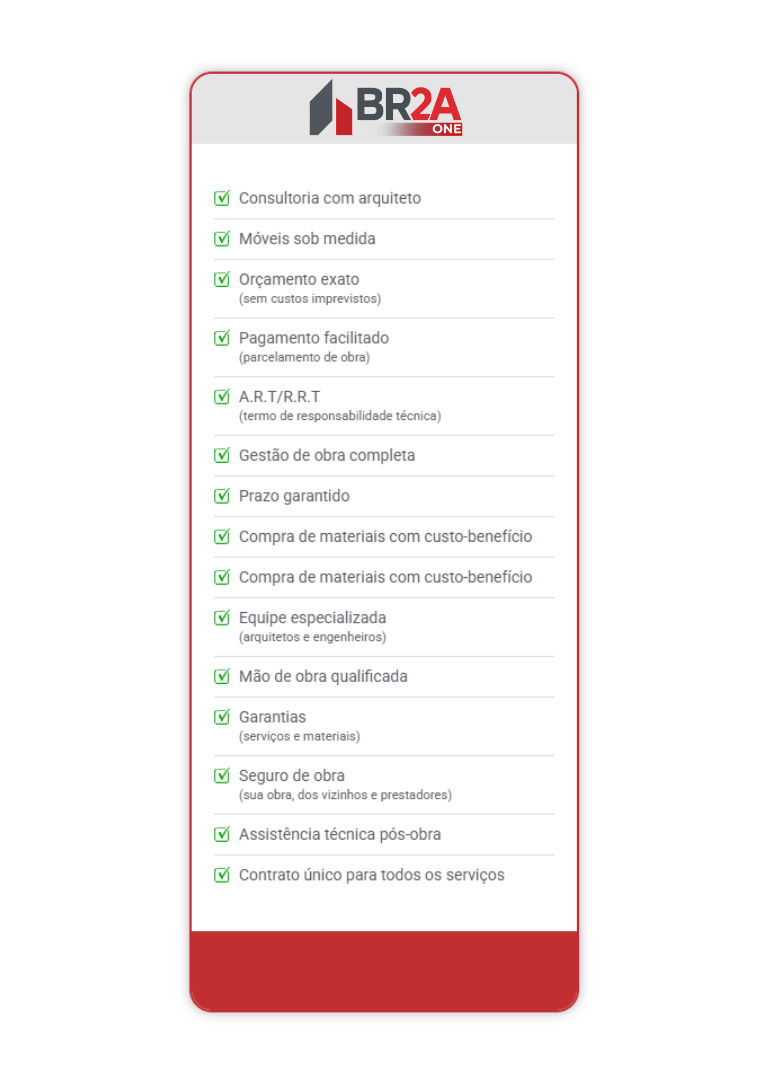 Cuidamos de todas as etapas da obra, como compra de materiais e disponibilização de mão de obra especializada.